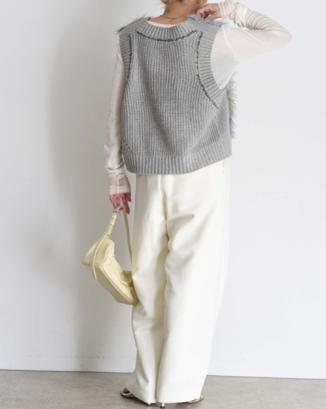 洗練されたスタイリッシュさと着心地の良さが魅力の「Eimee Law シャギーベスト」。前後切り替えデザインやフェザーニット素材が個性的で注目度抜群。季節感漂うグレーも素敵。スタイリングの幅が広がる1着。 #EimeeLaw #シャギーベスト