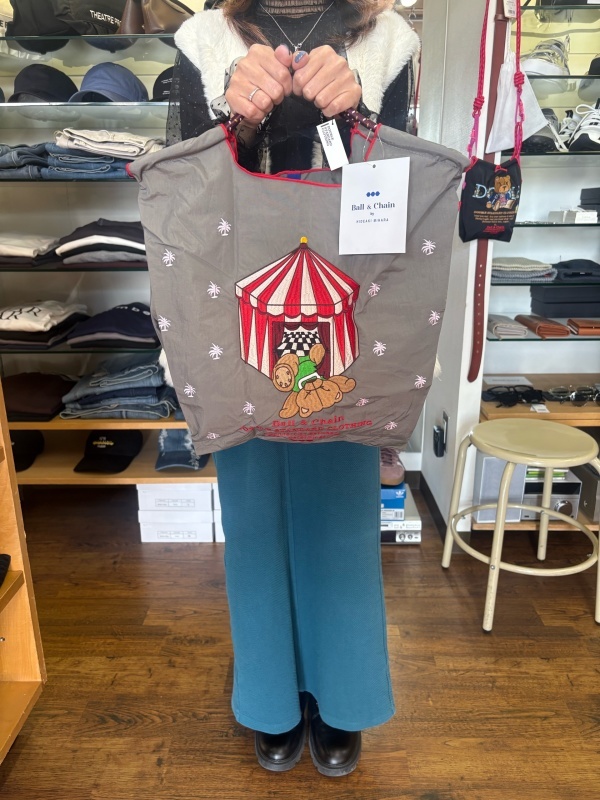 コロンとした形が愛らしいダブスタ×BALL&CHAINコラボエコバッグ! テントから転がる熊が可愛い刺繍デザイン🐻 コンパクトでもしっかりとした生地感で機能性も抜群。キレイめスタイルから遊び心のあるコーデまで幅広く活躍します。 #DOUBLESTANDARD #コラボバッグ